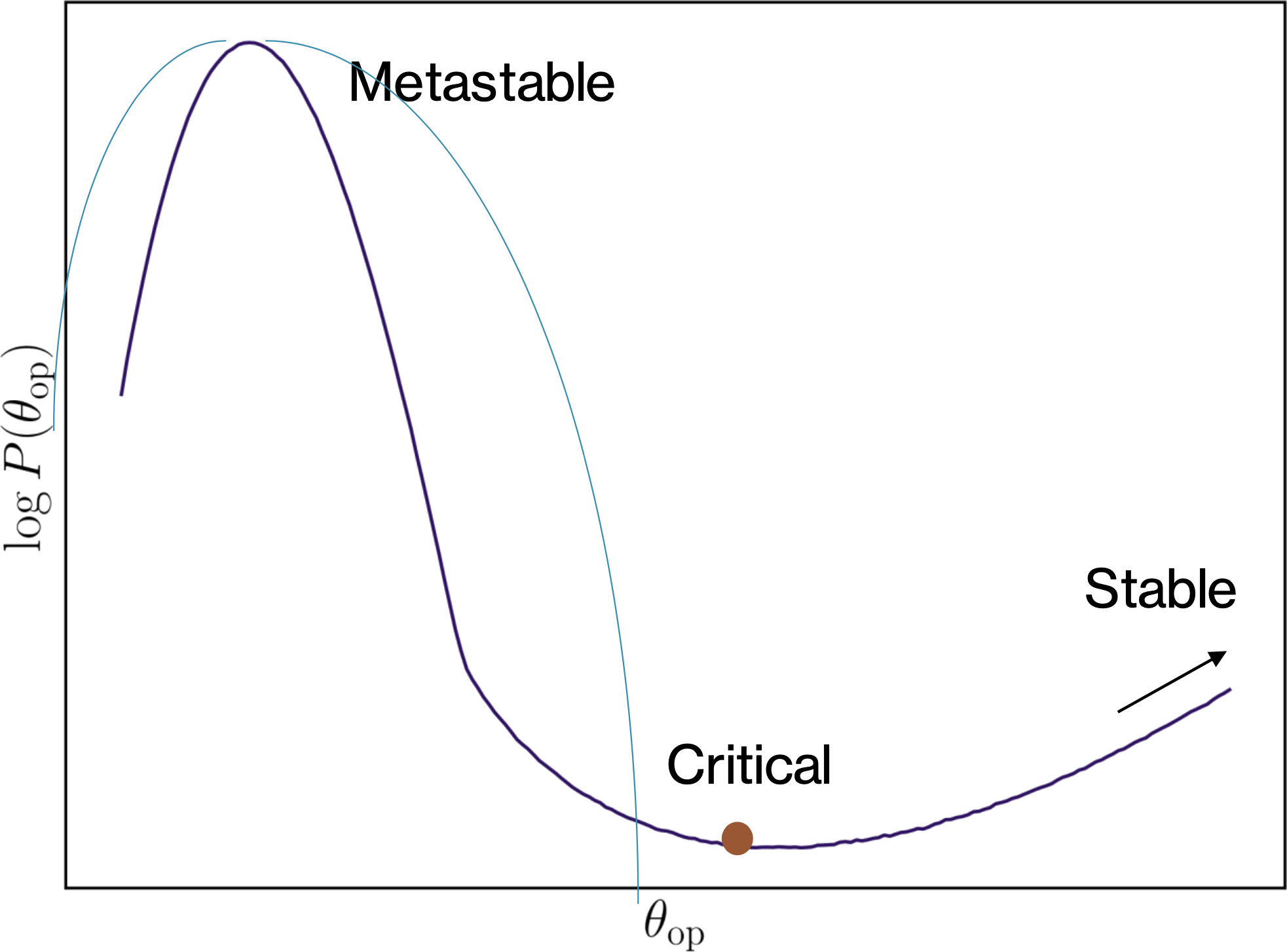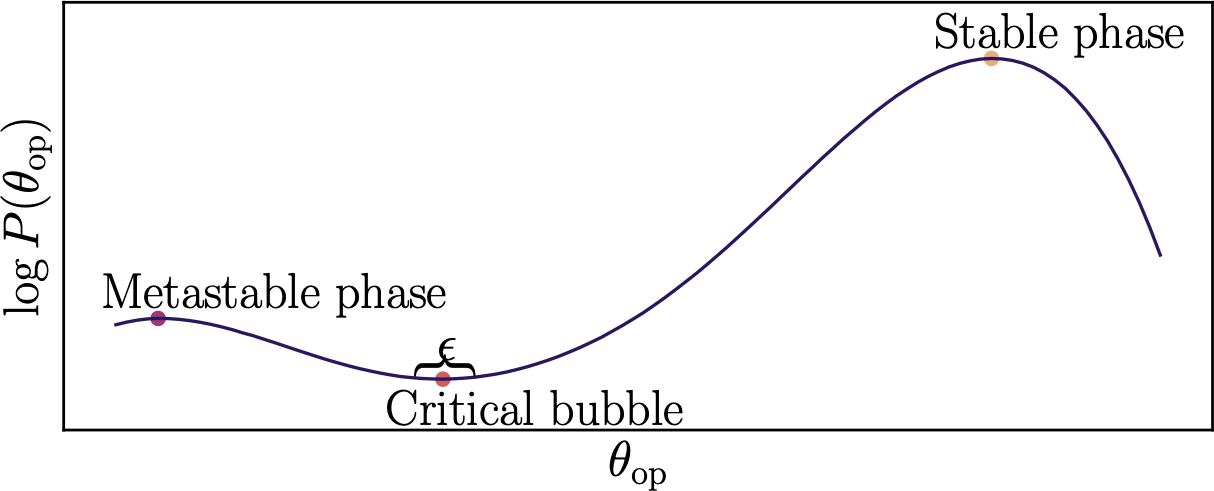 - Calculate probability of critical bubble $P_\mathrm{c}$ relative to metastable phase