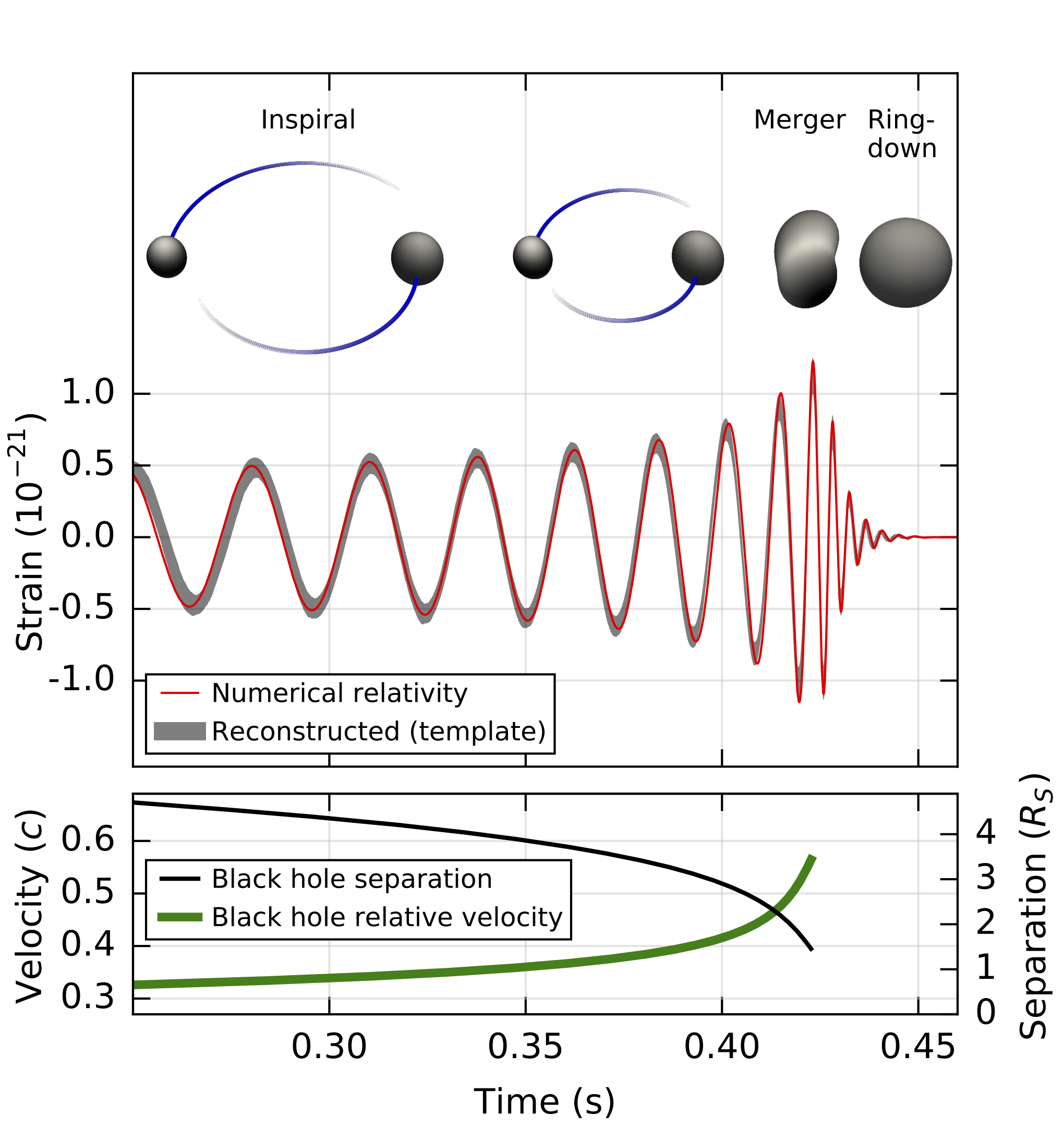 - Gravitational wave power output: $7\times 10^{24} \, \mathrm{W}$