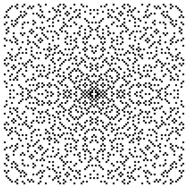 Gaussian primes en.wikipedia.org/wiki/Gaussian_integer#Gaussian_primes p[x_, y_]:= Polygon[{{x+.5, y+.5}, {x-.5, y+.5}, {x-.5, y-.5}, {x+.5, y-.5}}]; Apply[Show, Join[Map[Graphics, Module[{l, b}, l = {}; Reap[ Do[If[PrimeQ[a + b I], Sow[p[a, b]]], {a, -50, 50}, {b, -50, 50}]]]]]]