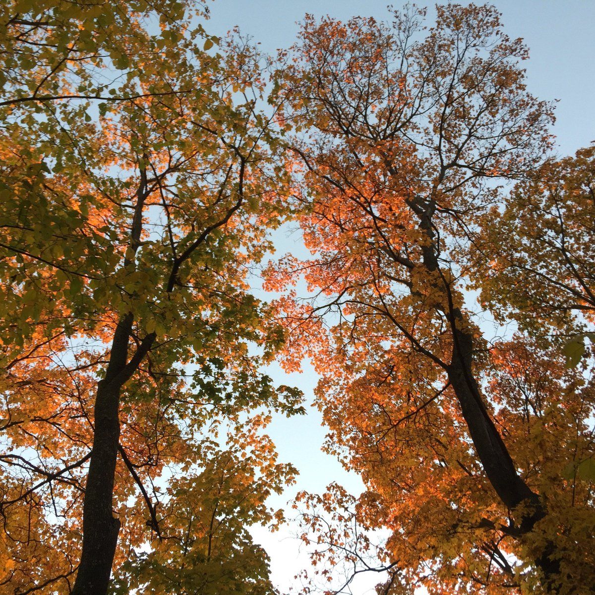Three minutes after sunrise at 07.50 today, the first rays of sun are hitting these trees. Happy autumn, Twitter.