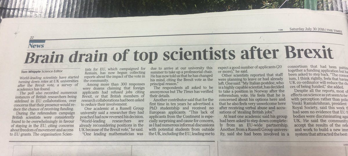 : The Times reports leading scientists turning down roles in UK Universities post Brexit.
